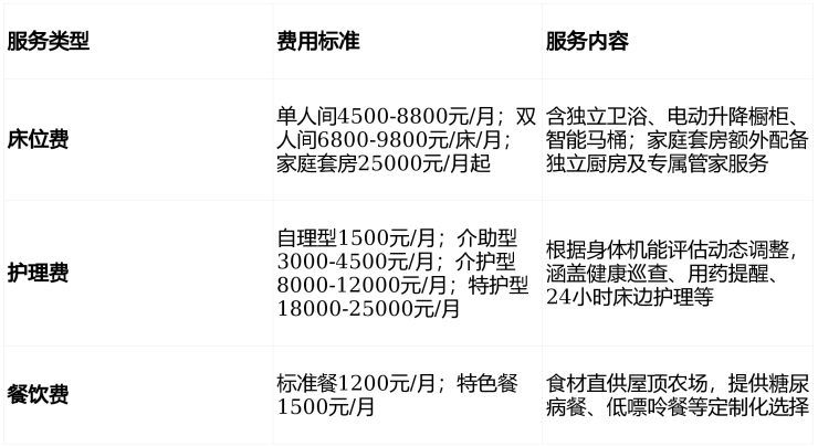 中心采用“基础服务包+分级护理费”模式,月收费区间为3000元至25000元,具体构成如下: