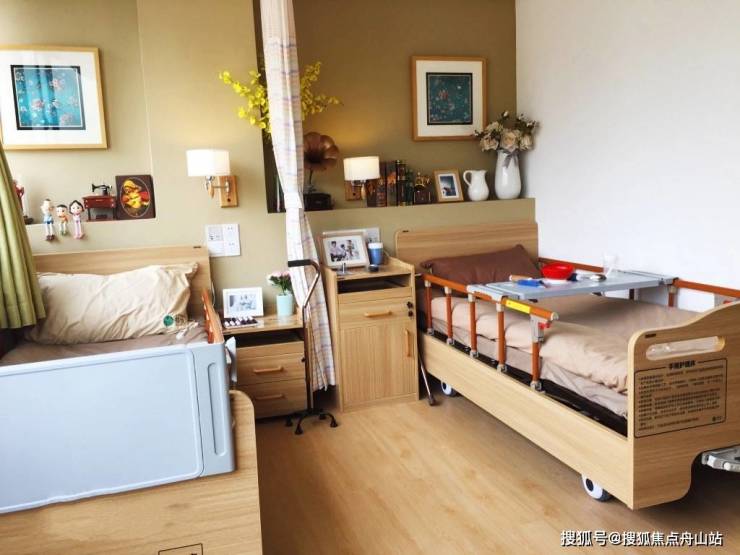 房间采用圆角家具、感应夜灯,配备防压疮床垫与多功能护理床,贴合长者生活习惯。