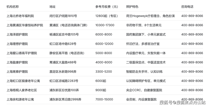 一、上海失智养老院综合对比一览表