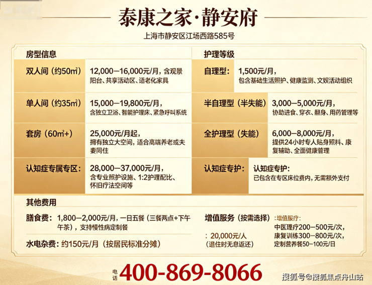 泰康之家·静安府收费总价10000元起/月!采用“房型费+护理费+餐费”的透明复合收费模式,无隐形消费,家属满意度高。
