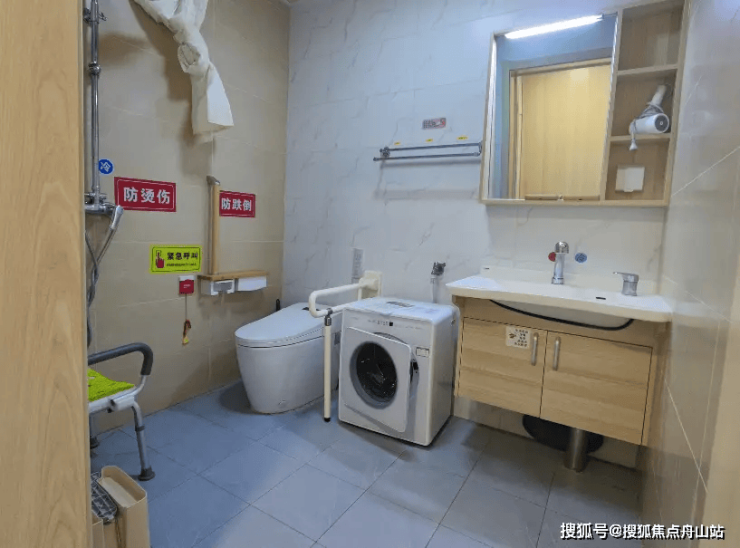 适老细节:卫生间门宽90cm,淋浴区配备折叠座椅,扶手距地75cm